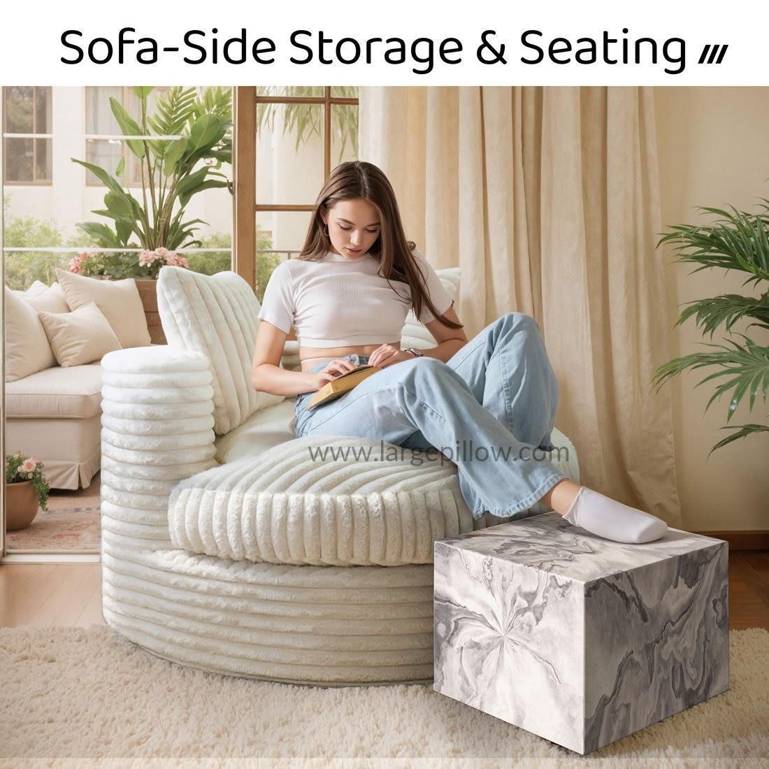 - Monipuolinen muotoilu: Moderni kuutiorahi, joka toimii jalkarahina, lisäistuimena tai koristeellisena yksityiskohtana silmiinpistävällä syykuvioinnilla.